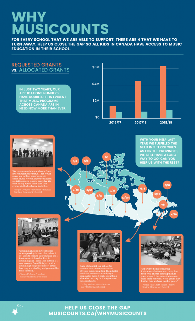 This infographic shows the gaps we’re trying to address and stories from previous MusiCounts instrument grant recipients. Click here or the image to view a larger version.