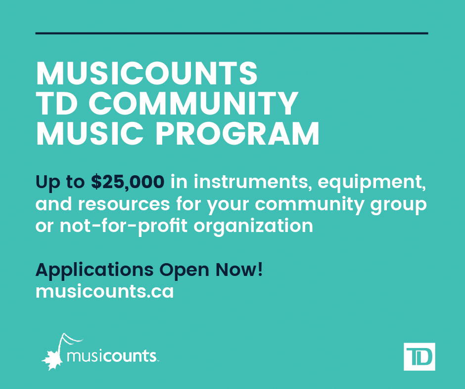 Applications for the MusiCounts TD Community Music Program are now open! The program, which awards grants of up to $25,000 for instruments and equipment, is open to not-for-profit organizations and community groups.