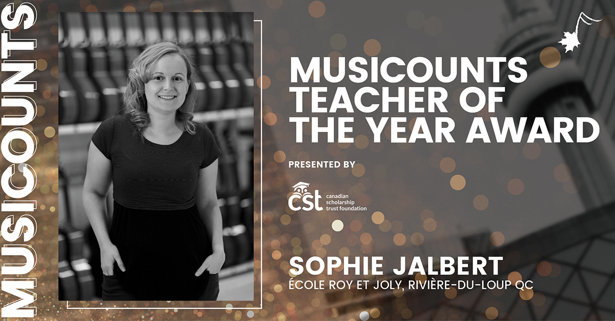 We couldn’t agree more. Sophie Jalbert is one of five nominees for the MusiCounts Teacher of the Year Award, presented by the Canadian Scholarship Trust Foundation. The winner will be announced at the 50th JUNO Awards in May, and will receive a JUNO statuette, a $10,000 prize, and a sizable grant for the music program at their school.