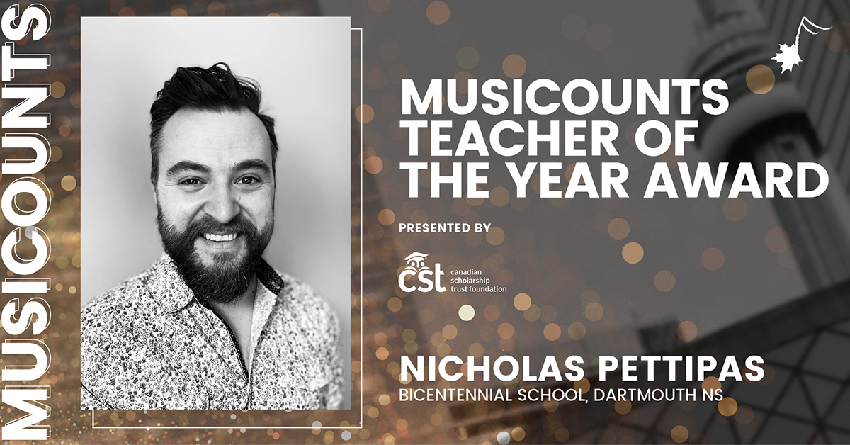 Nicholas Pettipas is one of five nominees for the MusiCounts Teacher of the Year Award, presented by the Canadian Scholarship Trust Foundation. The winner will be announced at the 50th JUNO Awards in May, and will receive a JUNO statuette, a $10,000 prize, and a sizable grant for the music program at their school.
