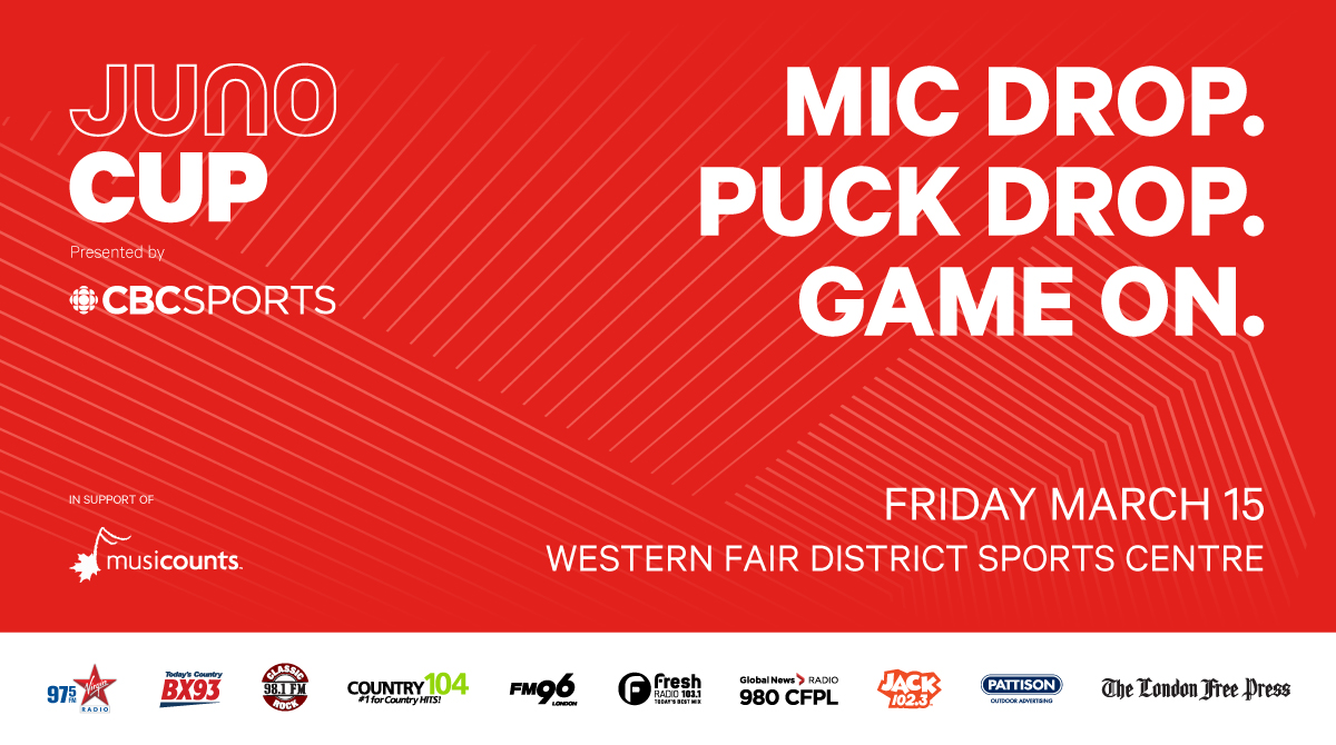 JUNO Cup Presented by CBC Sports, taking place March 15, 2019 at Western Fair District Sports Centre, where Canadian musicians and NHL legends go head-to-head on the ice to support MusiCounts, Canada’s music education charity associated with the JUNO Awards. Individual tickets to JUNO Cup are priced at $20 (plus fees) or $15 (plus fees) when purchasing 10 or more tickets. All proceeds benefit MusiCounts. Tickets go on sale Friday, November 30 at www.budweisergardens.com