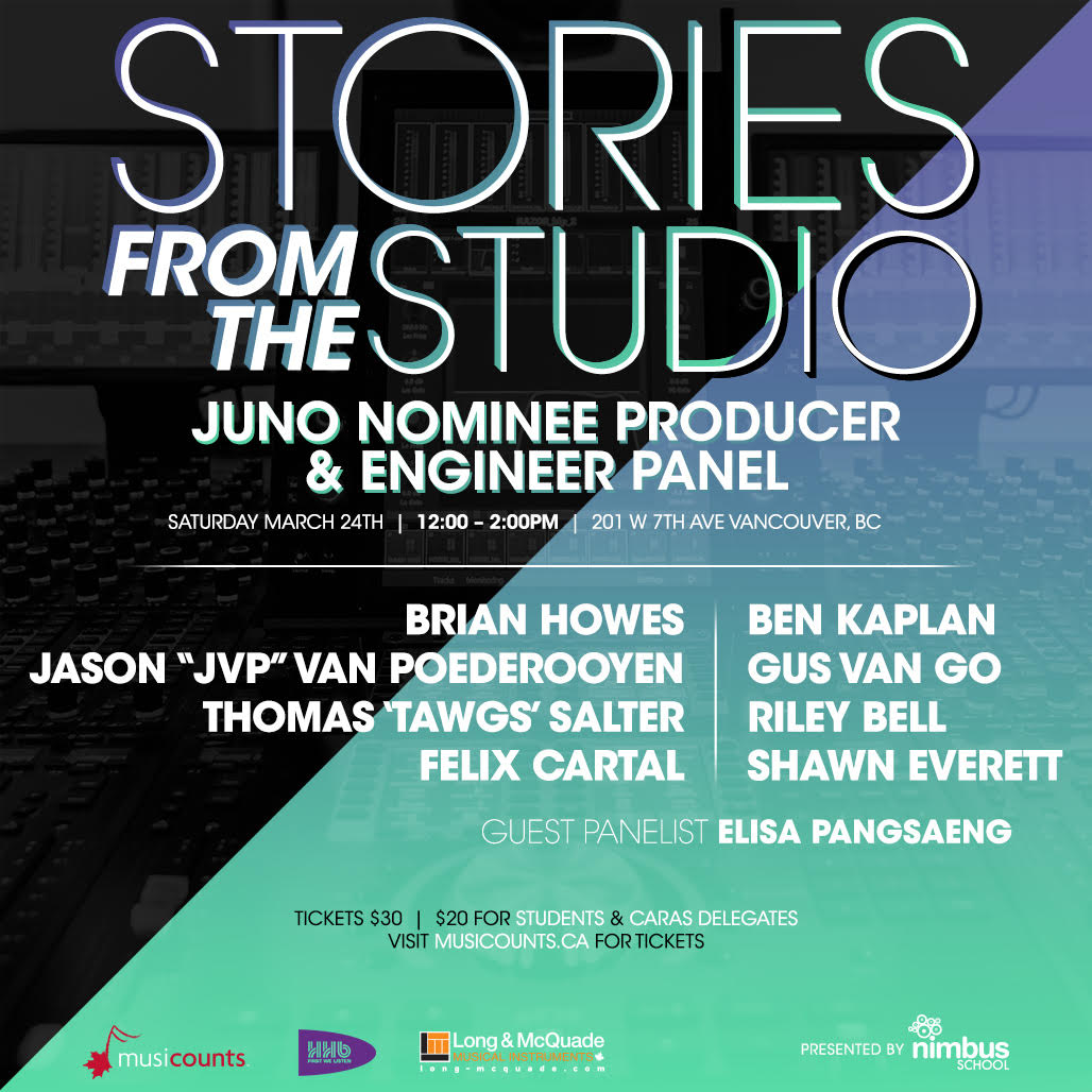 What: A panel discussion featuring JUNO Award Nominees from the Jack Richardson Producer of the Year Award and Recording Engineer of the Year Award and special guests. All proceeds benefit MusiCounts