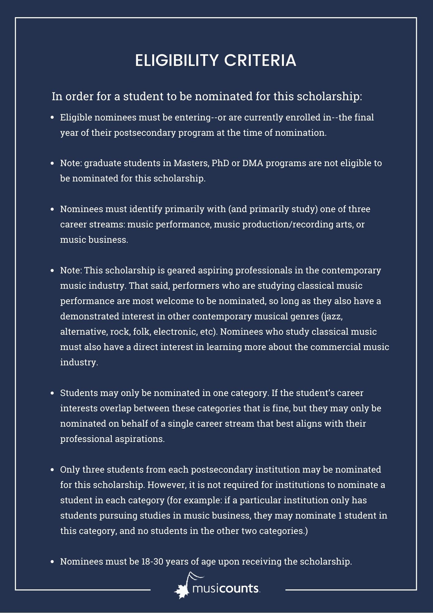 Who Can Be Nominated: Each postsecondary institution in Canada can nominate up to 3 students enrolled in music studies (undergraduate degree, diploma or certificate) who intend to pursue a career in one of the following career streams: music performance, music production/recording arts, or music business. Institutions can nominate one student per stream.